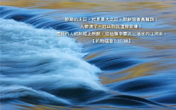 「节期的末日,就是最大之日,耶稣站着高声说:『人若渴了,可以到我这裡来喝。信我的人,就如经上所说:从他腹中要流出活水的江河来。』」(约七37~38) 【每日一词】人若渴了 当时在主耶稣「住棚节」末日的呼喊,围观的人议论纷纷,并没有引起多少正面的回响;可是这话却在人类历史的天空迴盪了近两千年,久久不能褪去。因为祂过去在呼喊,现在仍在呼喊。祂的呼喊不仅是对未信主的人,也是对每一个基督徒呼喊,因为祂的「人若」这两个字是指每一个人说的。这是每一个人无法改变的事实,仅管我们一生觅觅寻寻,内心永难在这心灵空虚、乾渴的世界裹得着满足。因此,主耶稣站着高声呼喊是十分有意义的,因为祂向一切乾渴的人类挑战,宣告祂能满足人深处的乾渴。 那麽我们如何才能经历生命活水的供应呢?
