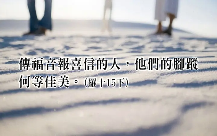 「若没有奉差遣,怎能传道呢?如经上所记:『报福音、传喜信的人,他们的脚踪何等佳美。』(罗十15) 【每日一词】他们的脚踪何等佳美 这句话是引自《以赛亚书》五十二章7节,原是指那些将好消息带给被掳之民,告诉他们即将自巴比伦得释的人。在此保罗引用来形容传福音的人,带来人们可从罪的奴役中得释放的好消息。 此外,今日钥节说出神多麽喜悦我们对人传福音。但不要以为只有全职的传道人或教会的长执才能传福音;主已经把传福的使命託负给每一个基督徒。我们有责任「接受福音」以致蒙恩,也有责任「传扬福音」,以致别人因而蒙恩。所以我们必须跟人分享神的福音,好叫其他人都有机会听到。我们的亲友怎麽样能听到福音呢?除非有人告诉他们。历世历代的教会,多少圣徒,他们用他们的鲜血和神的大能来传扬福音,先知以赛亚早就看见他们就说:「他们的脚踪何等佳美」。弟兄姐妹,神不是已经呼召我们向周围的人传福音吗?让我们立即起步,接续前人传福音佳美的脚踪吧!亲爱的,我们每一天的脚踪都是佳美的吗? 【利用每一个机会传福音】 人听到福音才能得救:有时候,普通的弟兄比传道人有更好机会向别人见证耶稣基督。在商业或专业圈子,工厂、学校、邻舍中,我们都会遇到很多从未上过教会的人。 一天,一位弟兄到市中心商业大厦的一间财务管理公司谈生意。当他离开时,与一位朋友一起搭乘升降机。当时的升降机仍是由人控制的。当升降机在下降时,那平信徒对控制员说:「希望在你作最后一程时是上升而不是下降的。」那控制员以诧异的目光望着他。「小姐,」他说:「我年事已老,今年七十岁了,总有一天我会离世与我的救主耶稣基督见面。我希望将来在那边也能见到你。」这位女士从没有忘记这个见证。 亲爱的,传福音的机会总是环绕着我们的,我们需要处处留心,并求那差遣我们的主帮助我们,好利用每一个机会,作主祝福的运河,而不作拦水坝。 【每日一歌】主我不过是你运河 ➤ 点此诗歌网址 不过作一祝福运河,