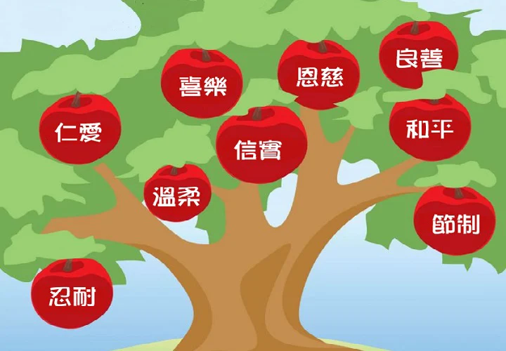 2. 其表现 ── 「圣灵所结的果子」提到九种美德,可分成三组,第一组是向神:仁爱、喜乐、和平;第二组是向人:忍耐、恩慈、良善;第三组是向自己:信实、温柔、节制。这样我们看见这三组分别向神、向别人、向自己,表达出基督徒结出好果子的生活。这三组又指出,圣灵的果子是圣灵结的,乃是因我们顺从圣灵而生活的自然表现。