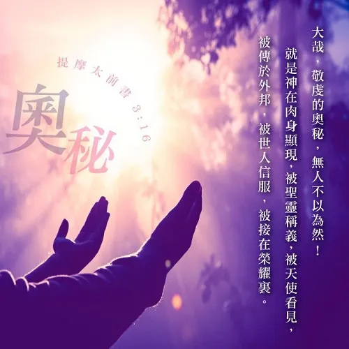 「大哉,敬虔的奥祕!无人不以为然:就是神在肉身被显现,在灵里被称义,在使者中被看见,在外邦中被传扬,在世人中被信服,在荣耀里被接。」(提前三16原文直译) 【每日一词】 今日钥节提到「大哉,敬虔的奥祕。」保罗启示大哉敬虔的奥祕,就是神在肉身显现,为《提摩太前书》之重要的一节,须研读明白。本书一再提及「敬虔」共八次之多(提前二2;三16;四7~8;六3,5~6,11),而原文为 eusebeia,意指美好的虔敬表现。「敬虔」就是神在肉身显现,就是说主耶稣道成肉身,在祂身上彰显神。照样,教会是基督的身体,要彰显这「敬虔的奥秘」。当教会的光景正常,圣徒们都活出基督,那结果就是被圣灵称义,被天使看见,被传于外邦,被世人信服,被接在荣耀里。 此外,保罗揭开了那大哉,无人不以为然的「敬虔的奥秘」,值得我们注意的就是: