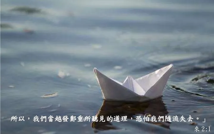 2. 「随流失去」 ── 在原文(pararrein)有两个意思,一个是没有目的「漂」,另一个是失去的「漏」,就如一条船因为锚,没有抓紧海底,而被潮流冲走。「随流」的意思就「漂」,「失去」的意思就是「漏」。「漂」如导航员沉睡不醒,疏忽了风向,使船只溜过应驶进的港口或避风港,因而飘流毁灭。「漏」如指环在手指上滑落,或一些食物不小心掉下来;说话时,不小心漏出了一些隐情;在辩论中,忽略了别人某一论点;一些事实轻轻在心里溜走而记不起来;透露了一些秘密出来。「漏」即因为有洞,以致把所听见这麽多关於主耶稣的事情,以及神的话都漏掉了。我们必须对付那些洞 ── 那些会叫我们漏的原因:不审判罪丶不诚实丶说谎等等。「漂」就是不用力气,随水流,水往那里去,你也不知不觉往那里去。飘没有一定的目的地,也许一直在那里绕圈子。你要达到专一的目的地,你就必须用专一的力量来反对漂,向着标竿直跑,并且要有敏锐的感觉。