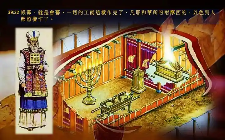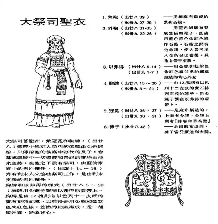 1. 「圣衣」 ── 「圣」希伯来文是 ÷ÉãÆùÑ,字音译是 qodesh,其意是「分别」,「神圣」(原文与「圣所」同字)。「圣衣」指大祭司服,与一般祭司服不同。比撒列用蓝色丶紫色丶朱红色线做精致的衣服,在圣所用以供职。这表徵「圣衣」的主要构成材料:必须是属天超越(蓝色),君尊(紫色),蒙恩得救 (朱红色线),才能供祭司的职分。在新约,祭司的圣衣就是耶稣基督,祂是我们的荣耀,是我们的华美。所以我们总要披戴基督(罗十三14);因为祂是我们的公义,我们的圣洁。