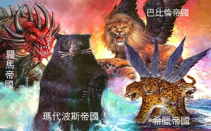 1. 「四兽」即尼布甲尼撒梦中的四大帝国 ── 巴比伦(有鹰翅膀的狮子)、玛代波斯(旁跨而坐的熊)、希腊(豹)、罗马(第四兽)。尼布甲尼撒的梦是关于这些帝国政权的相继兴衰;而但以理的梦则勾画了这些王国的邪恶、残暴。世人心目中所看到这些无所不能、无可攻克的大帝国,在神看来不过是凶暴、残忍,并且是毫无人性的禽兽;虽然那末日尚未来到,但是梦和异象所预示的,今天不少已经精确地应验了,也有尚待一一应验的。