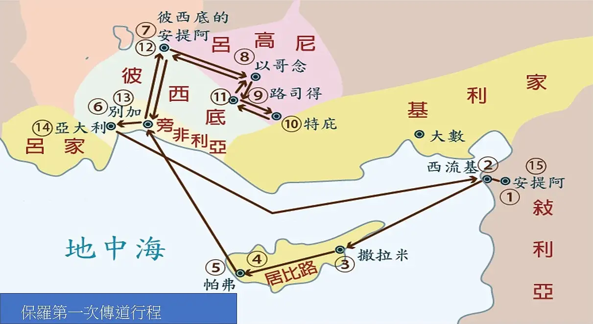 叙利亚的安提阿➜西流基➜撒拉米➜帕弗➜别加➜彼西底省的安提阿➜以哥念➜路司得➜特庇➜路司得➜以哥念➜彼西底省的安提阿➜别加➜亚大利➜叙利亚的安提阿。 点击看大图 上图路线说明:
