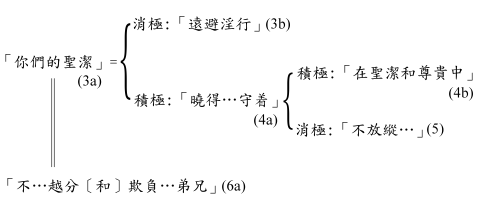 這堨峈漪O跟三章十三節不同的名詞「聖潔」,這字41在新約共用了十次:兩次指聖靈把人分別出來使之歸於基督的行動(帖後二13;彼前一12),其餘八次都是指「成聖」的過程或其果效(本節、4節、7節;羅六19、22;林前一30;提前二15;來十二14)。這就是說,信徒除了藉次t靈的工作(帖後二13;彼前一2;參羅十五16)、因信(帖後二13)、在基督堙]林前一2)在地位上成為聖潔(林前六11)之後,必須進而經歷在實際的生活行為上「成為聖潔」的過程。「你們的聖潔」可解為「你們(被神使你們)成為聖潔」,或「你們叫自己成為聖潔」,鑑於下文的重點是在信徒當做的事,後者較適合本段的文意;不過我們要同時強調,保羅絕對不認為信徒可以靠自己的力量成為聖潔,因此,「使自己成聖」的重點只是在信徒本身有責任,需要採取主動去使自己成為聖潔,卻絕不等於「靠自己成聖」;42事實上,在信徒採取主動的背後先有神的主動(腓二13),他們在「使自己成聖」的過程中,必須倚賴神的工作(帖前五23)以及聖靈的引導和能力(加五16、18、25b;羅八13、14)。「成為聖潔」本身的意思非常廣泛(參三13「聖潔」一詞的註釋),不過在本段,它的意思顯然是和「淫行」、「私慾的邪情」及「污穢」(3b、5、7節)相對,因此其重點是較狹窄地局限於「清潔」之意。保羅在下文(3-6節在原文是一句)以四個不限定格的詞引介的話闡釋「成為聖潔」所涉及的內容。43