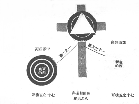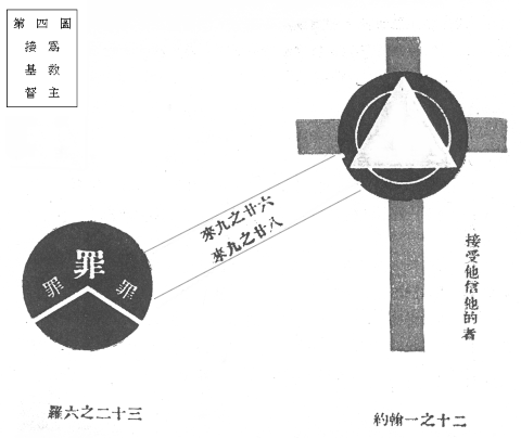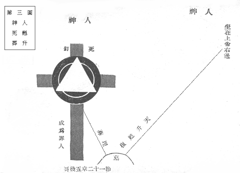 這圖左方的圓形是表明人罪的情況,十字架上的金色三角形是表明基督乃榮光的主,是神的兒子,他離天上的榮位降生成為人,負世人的罪釘上十字架,所以金色三角形外的黑圓形,是基督因我儕而成為罪人的意思。基督本無罪,但他因是救主,要擔罪人的罪,世人所有的罪都盡負之於十字架,所以聖經明言他無罪而成為有罪,他負罪在十字架時,甚至父神也離了他。