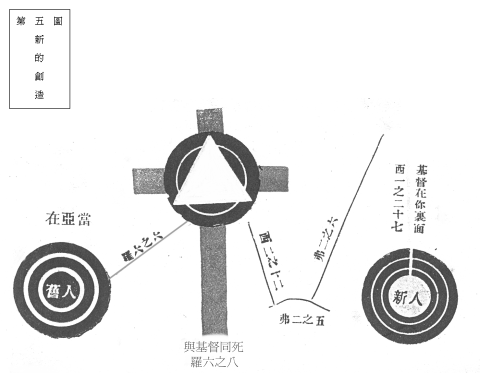 上帝完全的恩典很希奇的表顯在這種同釘十字架的榮耀的事實裏,──罪人與救主一同在十字架上,祇要人的信仰能夠完全,就可使這種事實變成他心靈的經驗中一種榮耀的真體。一個人要確切的從肉體的境界裏救贖出來,並且要使『舊人』確能退位;那末全靠他了解和接受這種同釘十字架的事實。新人的創造──與基督一同復活。