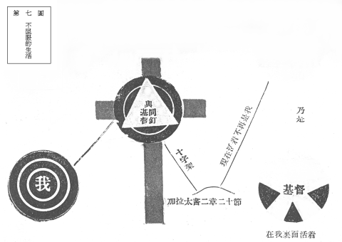 一個信徒的心靈上的歷史能夠寫成兩句話,就是『你們在我裏面』與『我在你們裏面』。在上帝看來,基督與信徒已經合成一體,所以基督在天上也在地上,信徒在地上也在天上。教會沒有基督,好像一個身體沒有頭;基督沒有教會,好像頭沒有身體。頭的豐盛是為身體,至於身體就是『充滿萬有者所充滿的。』歌羅西書二章九至十節說:『因為上帝本性一切的豐盛都有形有體的居住在基督裏面,你們在他們裏面也得了豐盛。他是各樣執政掌權者的元首。』又以弗所書一章二十二至二十三節說:『又將萬有伏在他的腳下,使他為教會作萬有之首,教會是他的身體,是那充滿萬有者所充滿的。』各位,上帝豈能更加明白告訴我們,他的旨意是要把基督的豐盛變成基督徒的豐盛麼?這是一種令人疑惑的思想。他的明顯意義就是說,你我與其他一切的基督徒要把基督從天上帶到地下,並且使人家在我們裏可看出他是誰,已經做了什麼工作,又在一個人的生活中能做些什麼事情。我們要把基督的生命變完全的形像,所以人可以在我們裏面看見他,並且用信心和愛心來使他們歸依他。這種合而為一的生活,使一個人的人格變成一種器具,在牠裏面主耶穌的美觀,聖潔,與榮耀,都很透明的放射出來。